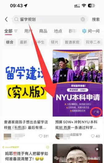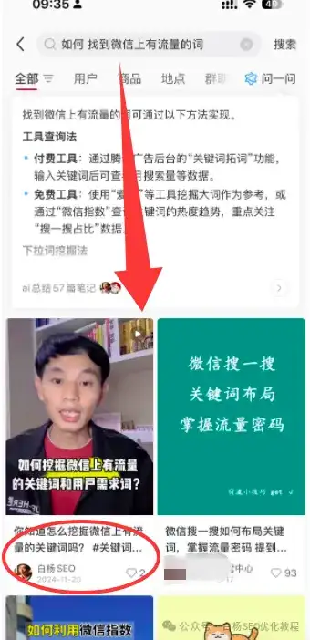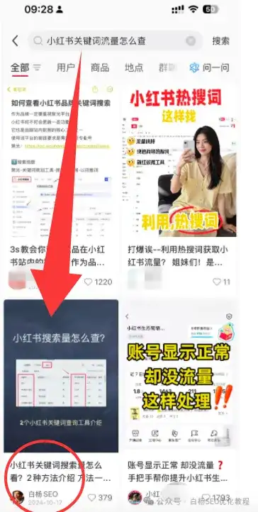 举例,比如在小红书上搜【小红书关键词流量怎么查】这个关键词,白杨SEO发布的笔记排在第3位,这就是小红书笔记排名。如图。