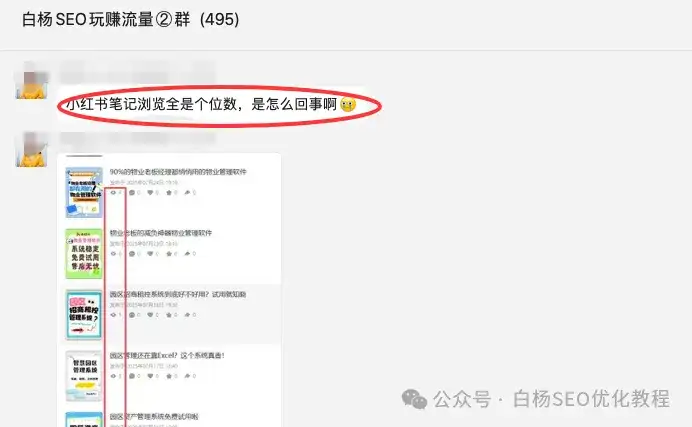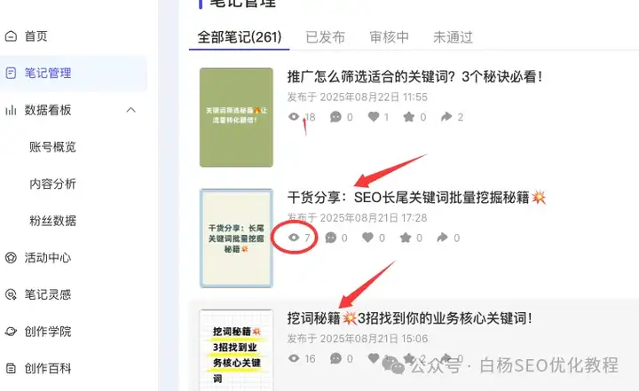 有人反馈小红书笔记浏览量个位数,有人反馈小红书笔记没收录,也没提示笔记违规,白杨SEO自己用AI生成了3篇笔记测试,也是没流量,如图。