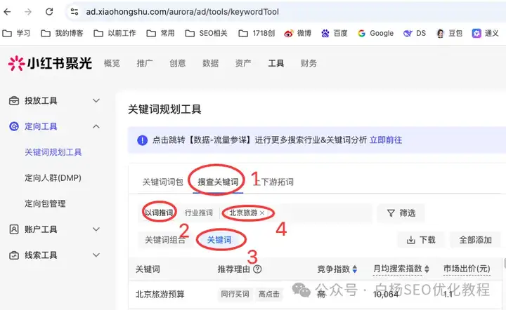 3、我们点搜查关键词-以词推词-输入关键词【北京旅游】-选关键词-按enter就出来了,顺序如图。