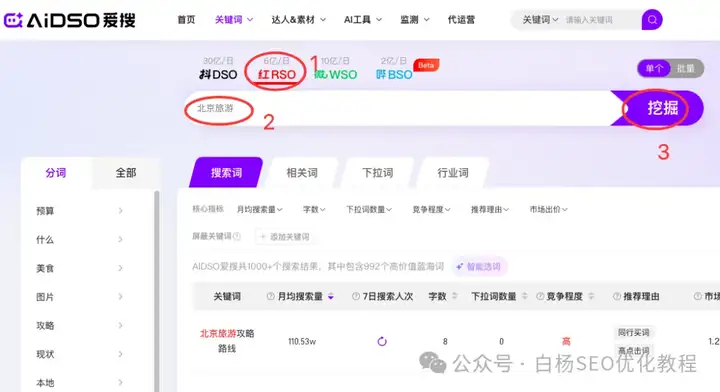 2、打开AIDSO工具首页,输入核心关键词,点红RSO那个,流程如图: