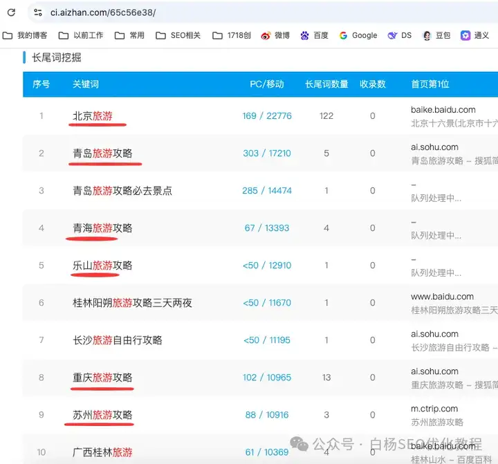 怎么找到旅游的核心热门词呢?白杨SEO以爱站工具实操举例截图: