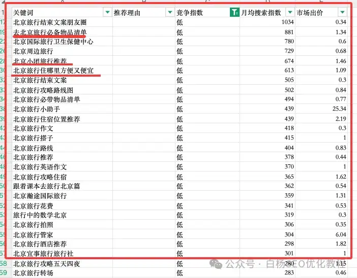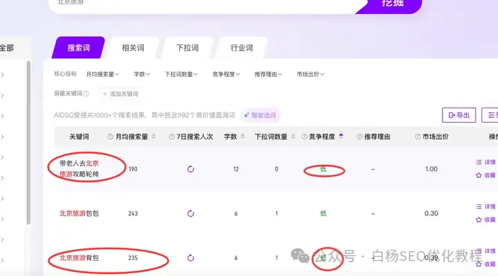 白杨SEO特别要补充说明一点的是,我们做免费自然搜索流量,也就是SEO的核心不是去找热门大词竞争,而是去找有一定搜索量但竞争度较低的蓝海词啊。