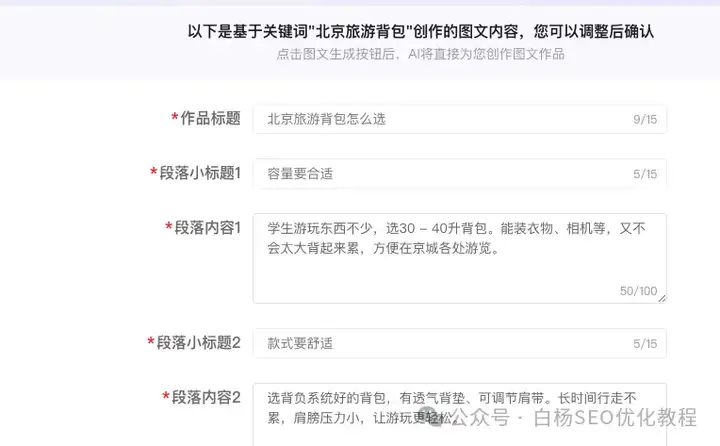 你可能会问,白杨SEO上面你不是说小红书对AI生成模板图文不给流量吗?我上面也说过,这个可以编辑,你可以修改啊,如果你觉得模板不行,你可以弄你自己的哈。