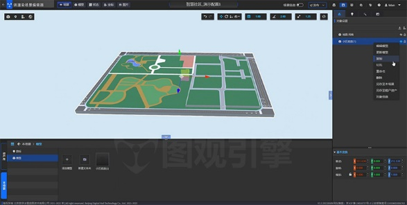 支持对导入模型 进行位置、旋转、缩放基本变换,并支持对模型对象进行强大的详细属性和行为配置,包括材质、粒子特效、关节、动画编辑。