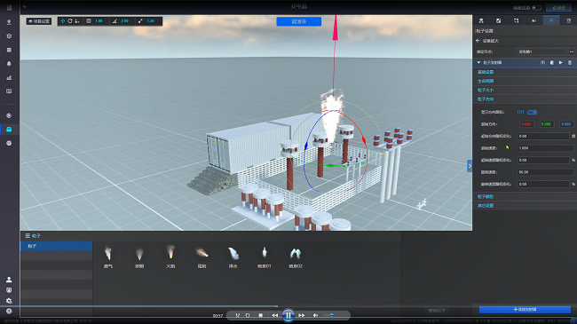 支持 全硬件加速 粒子系统,通过粒子发射频率,速度,角度,生命周期等参数,设置特定粒子效果,支持粒子组合成粒子组,实现复杂组合粒子特效;支持与模型节点位置绑定,支持关节数值控制粒子属性,预制粒子库,可实现逼真、可数据驱动的 火焰、爆炸、烟雾、雨雪等动态效果。