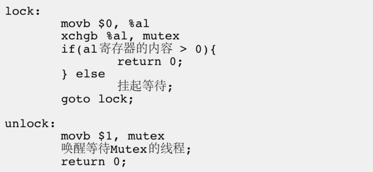 - 为了实现互斥锁操作,大多数体系结构都提供了 swap 或 exchange 指令,该指令的作用是把寄存器和内存单元的数据相交换,由于只有一条指令,保证了原子性,即使是多处理平台,访问内存的总线周期也有先后,一个处理器的交换指令执行时另一个处理器的交换指令只能等待总线周期。现在,我们把 lock 和 unlock 的伪代码改一下