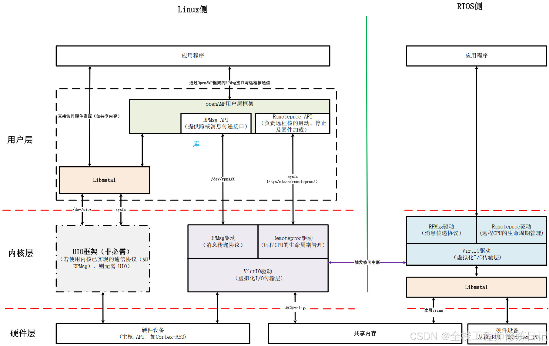 用户应用 → OpenAMP → Libmetal → 内核驱动(Remoteproc/VirtIO) → 硬件。