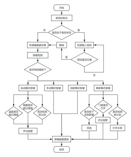 {keu_num = KEY_Scan(0); //按键扫描赋值switch(keu_num){case 1: //按键1按下/* ------------- 页面切换 -------------- */if(page_num == 1){if(home_mode==1){Pass_flag=1;}else{page_num = 2;OLED_Clear();OLED_Show_SecondPage();}}else if(page_num == 2){option++;if(option>3){option=0;page_num = 1;OLED_Clear();OLED_Show_FirstPage();}else OLED_Show_SecondPage();}break;case 2: //按键2按下if(page_num==1){auto_mode=!auto_mode;}else if(page_num==2){if(option==1)smoke_door+=15;else if(option==2)temp_door++;else if(option==3)humi_door++;}break;case 3: //按键3按下if(page_num==1){home_mode=!home_mode;}else if(page_num==2){if(option==1)smoke_door-=15;else if(option==2)temp_door--;else if(option==3)humi_door--;}break;case 4: //按键4按下break;}