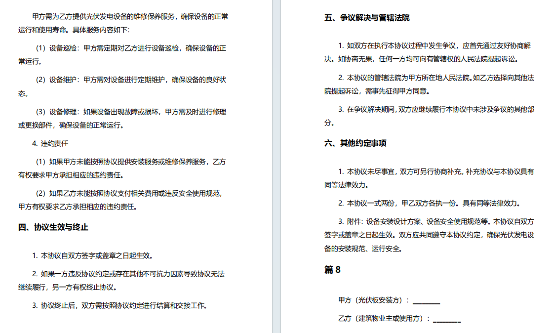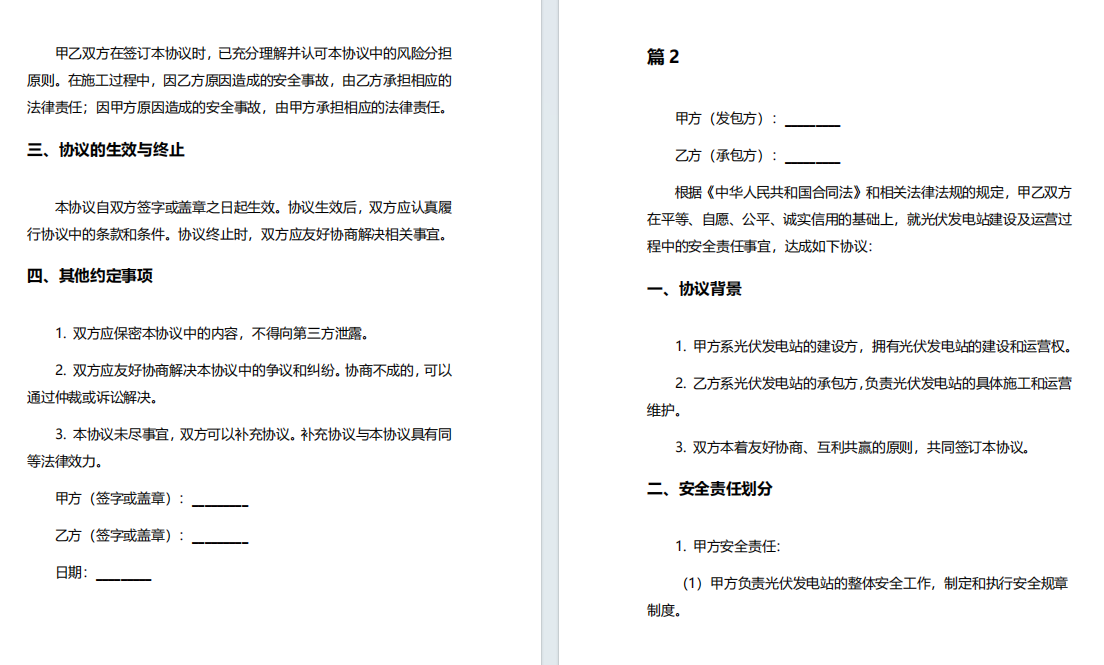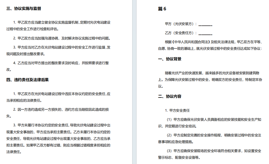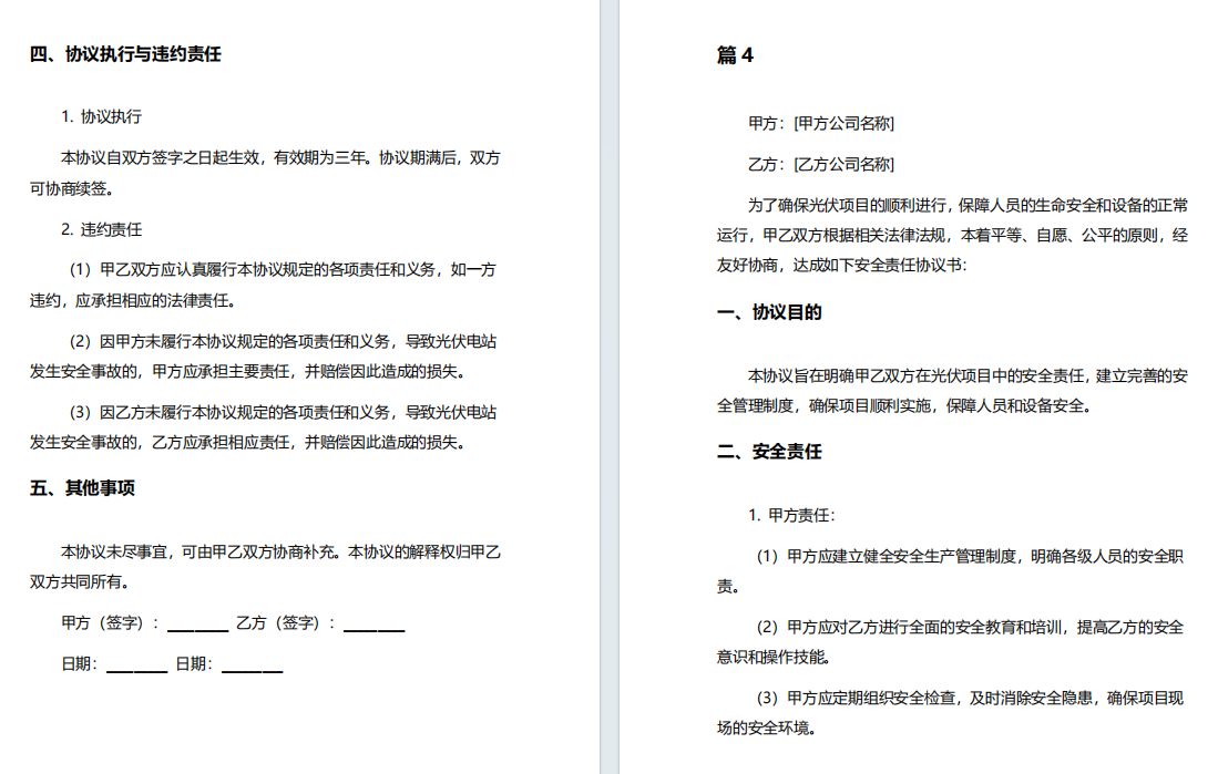 1. 甲乙双方在光伏电站建设过程中违反本协议约定的安全责任,应当承担相应的法律责任。