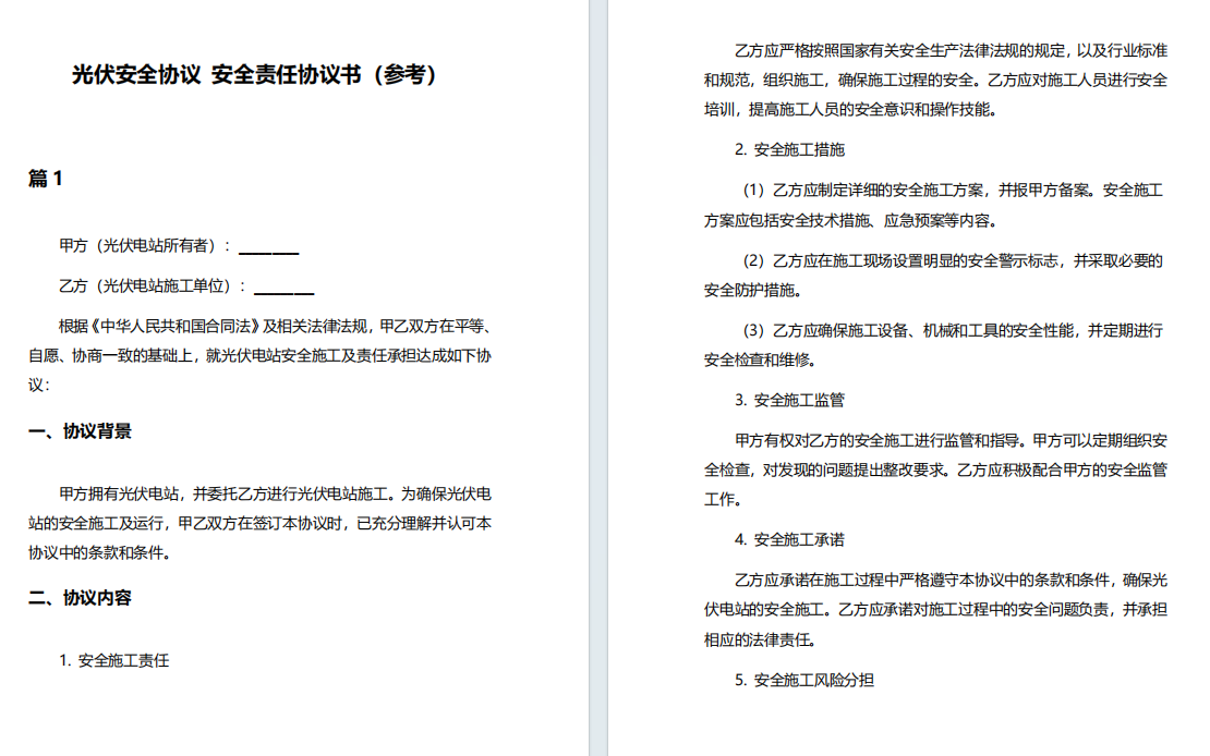 根据《中华人民共和国合同法》及相关法律法规,甲乙双方在平等、自愿、协商一致的基础上,就光伏电站安全施工及责任承担达成如下协议: