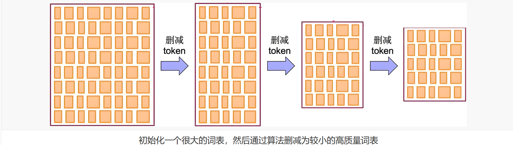 从大词汇表开始,逐步删除低概率的子词,保留最有效的组合。