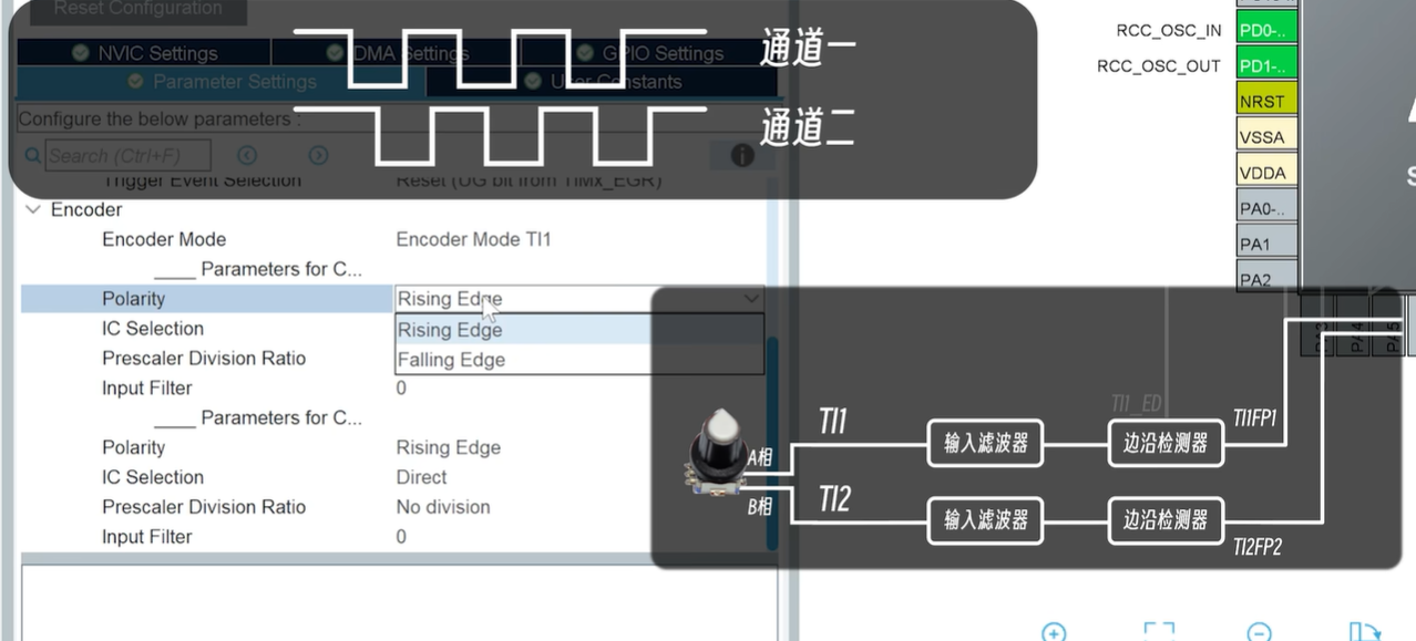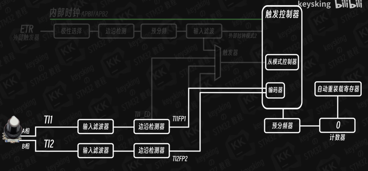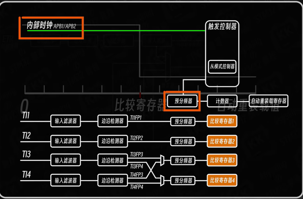 输入捕获只能进行直接捕获走TI1FP1和TI2FP2
