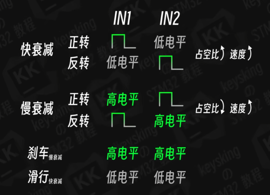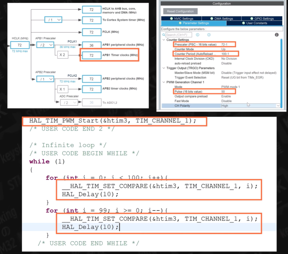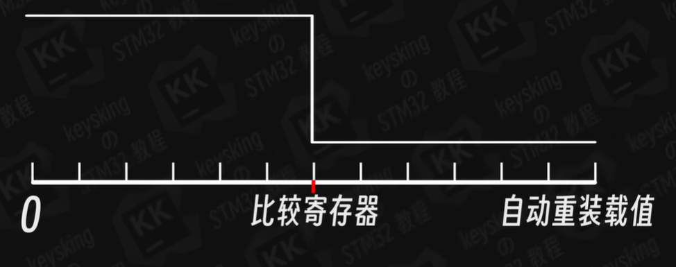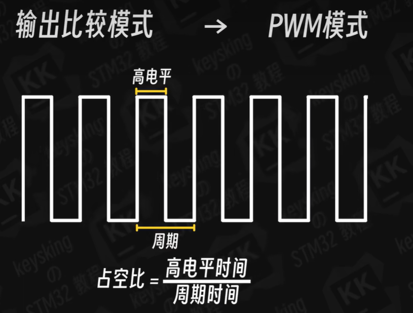 大于输出比较寄存器时输出另一种电平,修改定时器时钟源的速度以及预分频器等设置,可以修改计数器计数的速度。再加上修改自动重装载值,就可以调节PWM的周期频率。修改比较寄存器的大小,就可以调节PWM的占空比