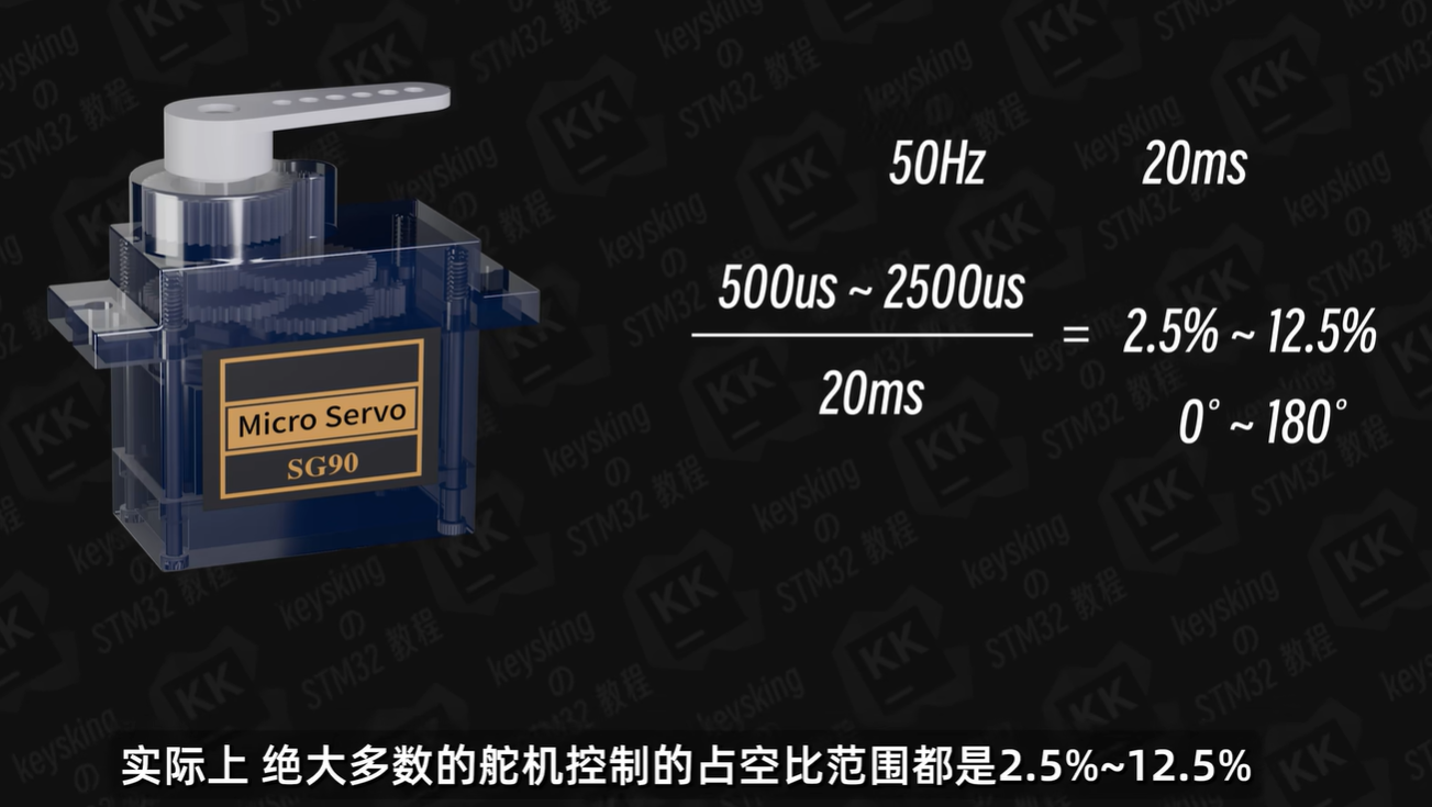 实际上绝大多数的舵机控制的占空比范围都是2.5%~12.5%,因为绝大多数的航模遥控器也都是输出这个范围的信号,