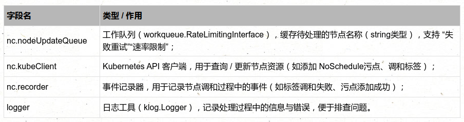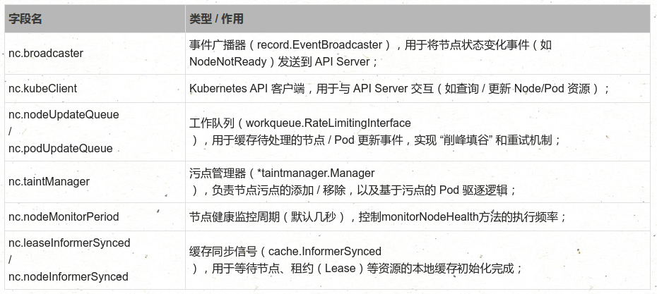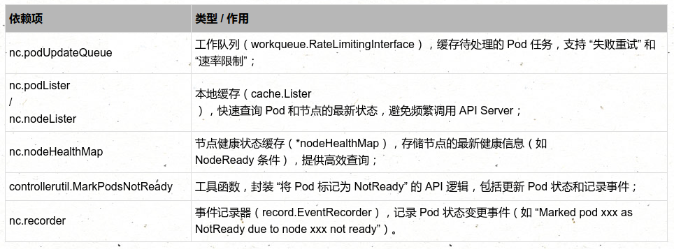 - nc.nodeInformerSynced/nc.podInformerSynced:Node/Pod 资源缓存同步;