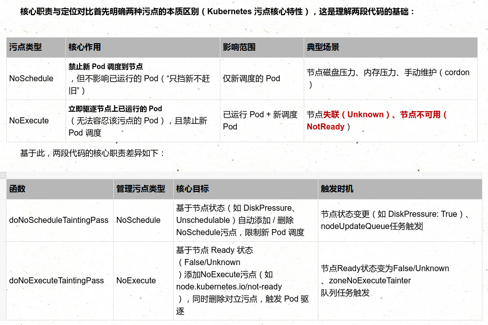 Kubernetes Node Controller(节点控制器)中 管理 NoSchedule 污点 的 doNoScheduleTaintingPass 和 管理 NoExecute 污点 的 doNoExecuteTaintingPass 方法。二者均通过 “生成期望污点→对比当前污点→调和差异” 的逻辑维护节点污点状态,但针对的污点类型、触发场景和作用效果完全不同(NoSchedule 限制新 Pod 调度,NoExecute 驱逐已运行 Pod)。以下从 函数职责对比、核心逻辑拆解、关键差异分析、典型场景 四方面详细解析,帮助理解两种污点的管理机制。