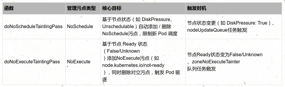 - nc.doNoExecuteTaintingPass 会遍历所有节点,检查是否需要添加 / 移除 NoExecute 污点,确保污点状态与节点健康状态一致。