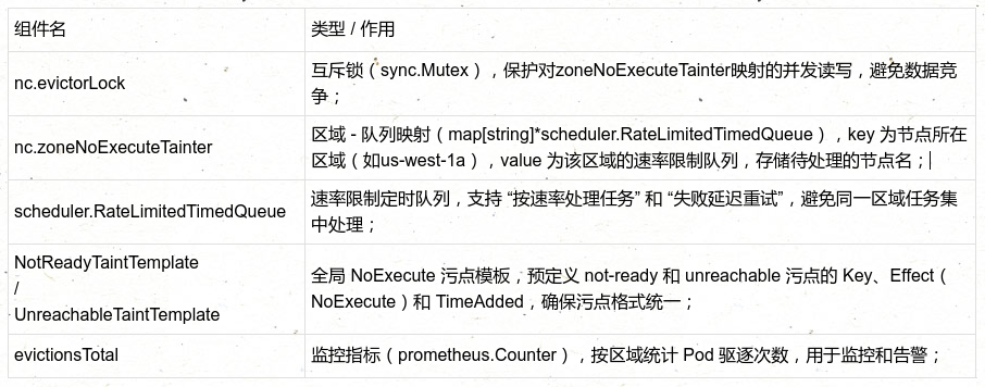 - 核心作用:定期执行 nc.doNoExecuteTaintingPass 方法(周期为 scheduler.NodeEvictionPeriod,默认 10 秒),处理 NoExecute 类型的污点(最严格的污点,会驱逐已调度的 Pod),避免因节点故障导致的 Pod 长期不可用。