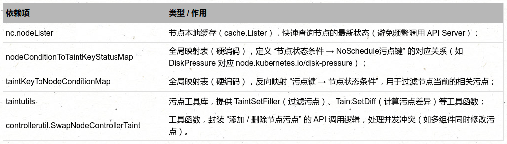 var nodeConditionToTaintKeyStatusMap = map[v1.NodeConditionType]map[v1.ConditionStatus]string{// 磁盘压力:当条件状态为 True 时,生成 disk-pressure 污点v1.NodeDiskPressure: {v1.ConditionTrue: "node.kubernetes.io/disk-pressure",},// 内存压力:当条件状态为 True 时,生成 memory-pressure 污点v1.NodeMemoryPressure: {v1.ConditionTrue: "node.kubernetes.io/memory-pressure",},// PID 压力:当条件状态为 True 时,生成 pid-pressure 污点v1.NodePIDPressure: {v1.ConditionTrue: "node.kubernetes.io/pid-pressure",},// 网络不可用:当条件状态为 True 时,生成 network-unavailable 污点v1.NodeNetworkUnavailable: {v1.ConditionTrue: "node.kubernetes.io/network-unavailable",},