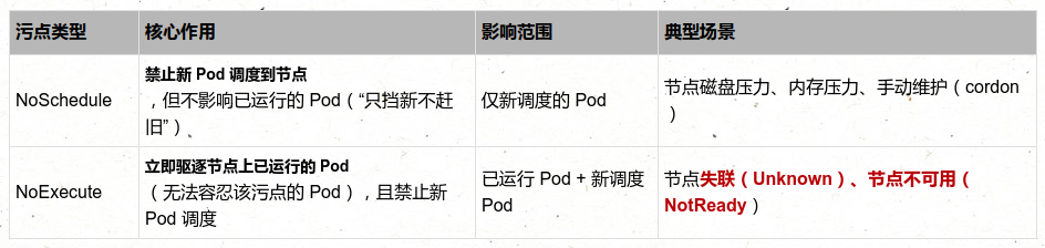 - 标准化价值:所有节点的 NoExecute 污点格式统一,确保依赖污点的组件(如 kubelet 驱逐逻辑、调度器污点匹配)能正确识别,避免因 Key 拼写错误(如 node.not-ready)导致功能失效。