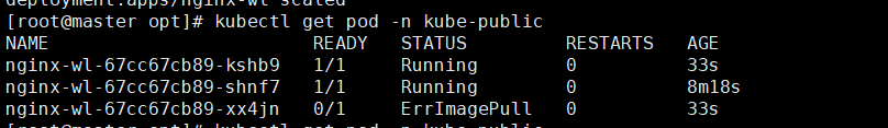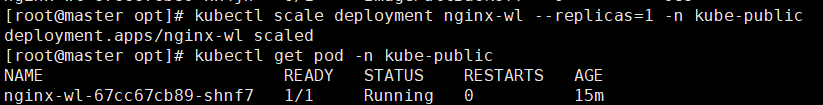 [root@master opt]# kubectl scale deployment nginx-wl --replicas=1 -n kube-public