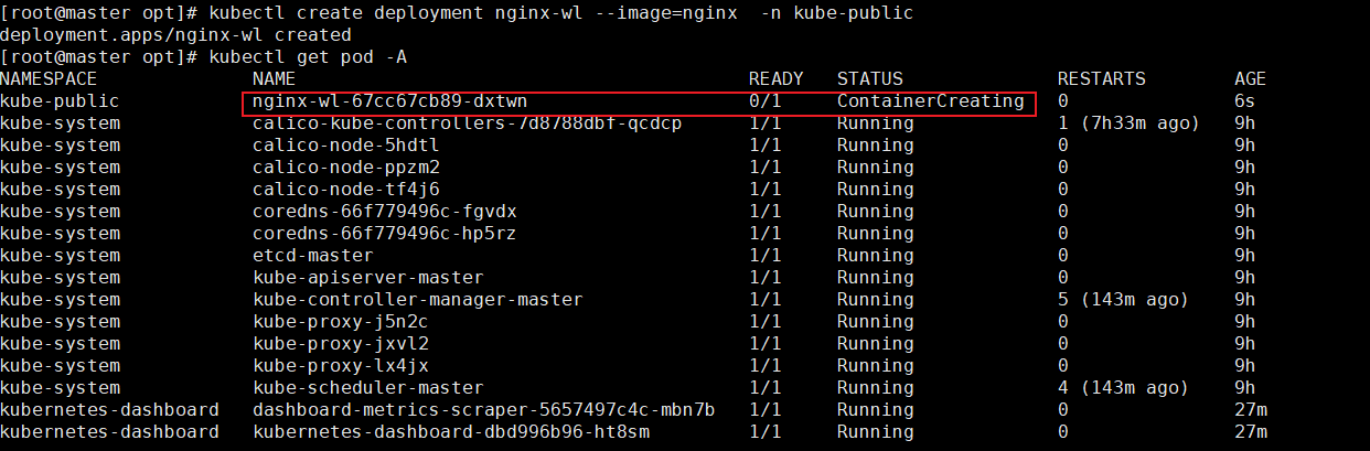 [root@master opt]# kubectl create deployment nginx-wl --image=nginx -n kube-public