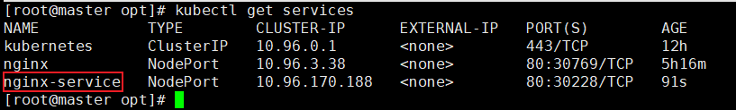 [root@master opt]# kubectl expose deployment nginx --port=80 --target-port=80 --name=nginx-service --type=NodePort