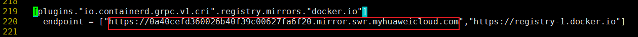 [plugins."io.containerd.grpc.v1.cri".registry.mirrors."docker.io"]endpoint = ["https://0a40cefd360026b40f39c00627fa6f20.mirror.swr.myhuaweicloud.com","https://registry-1.docker.io"]