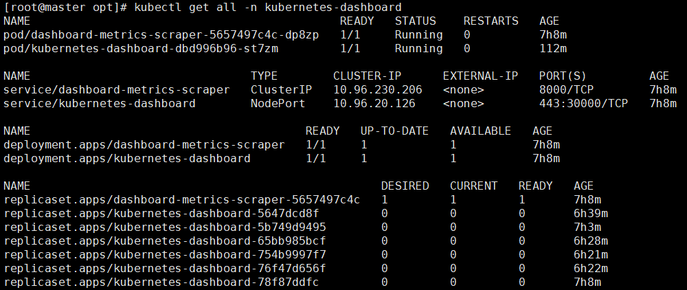 [root@master opt]# kubectl get all -n kubernetes-dashboard