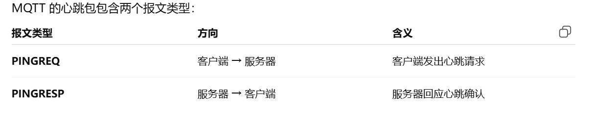 Q1:什么是 MQTT 心跳包? | 心跳包是 MQTT 客户端与 Broker 之间周期性发送的 PINGREQ/PINGRESP 控制报文,用于维持 TCP 长连接与检测在线状态。 |