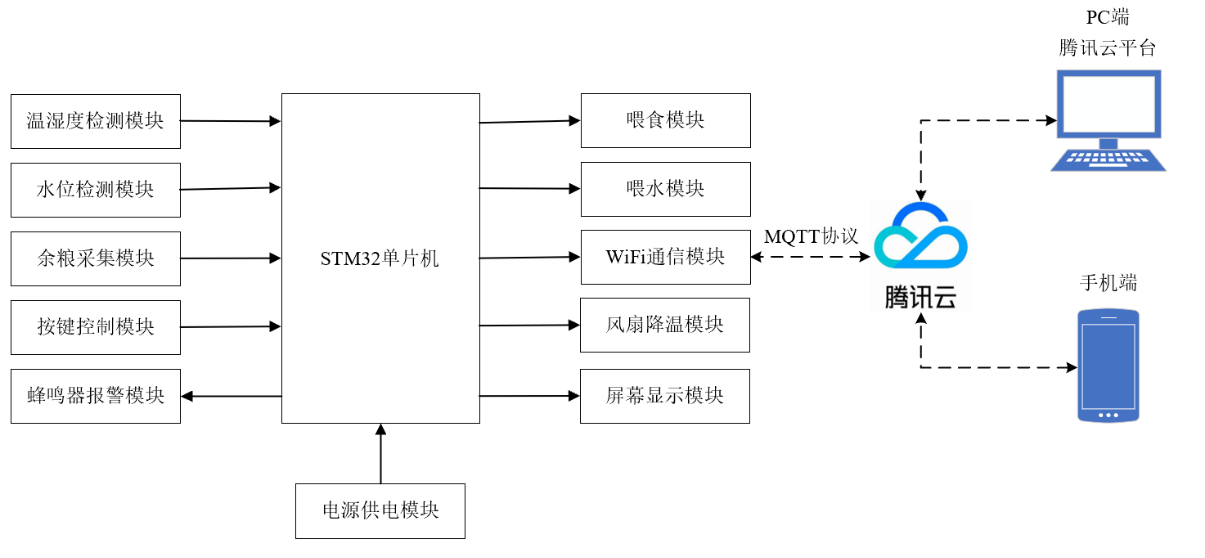 课题针对宠物饲养者外出、工作繁忙或出差等原因,无法及时照顾宠物,进而影响宠物的健康成长等问题,利用单片机技术、WiFi通信技术、传感器技术和云平台技术设计了一种基于STM32的智能宠物饲养系统,系统由STM32单片机、温湿度采集模块、余粮监测模块、水位监测模块、舵机喂食模块、风扇降温模块、舵机喂水模块、按键控制模块、屏幕显示模块、WiFi无线通信模块和电源供电模块等11个模块共同组成,实现对环境温度、湿度、食物余粮、储水量和水位情况进行实时监测,通过WiFi无线通信技术将监测数据上传腾讯云平台,实现数据的远程交互,饲养者可以手机端实现对宠物喂食装置的实时数据进行监测、阈值设定、定时与远程控制喂食喂水和接收余粮不足和储水不足的预警信息。