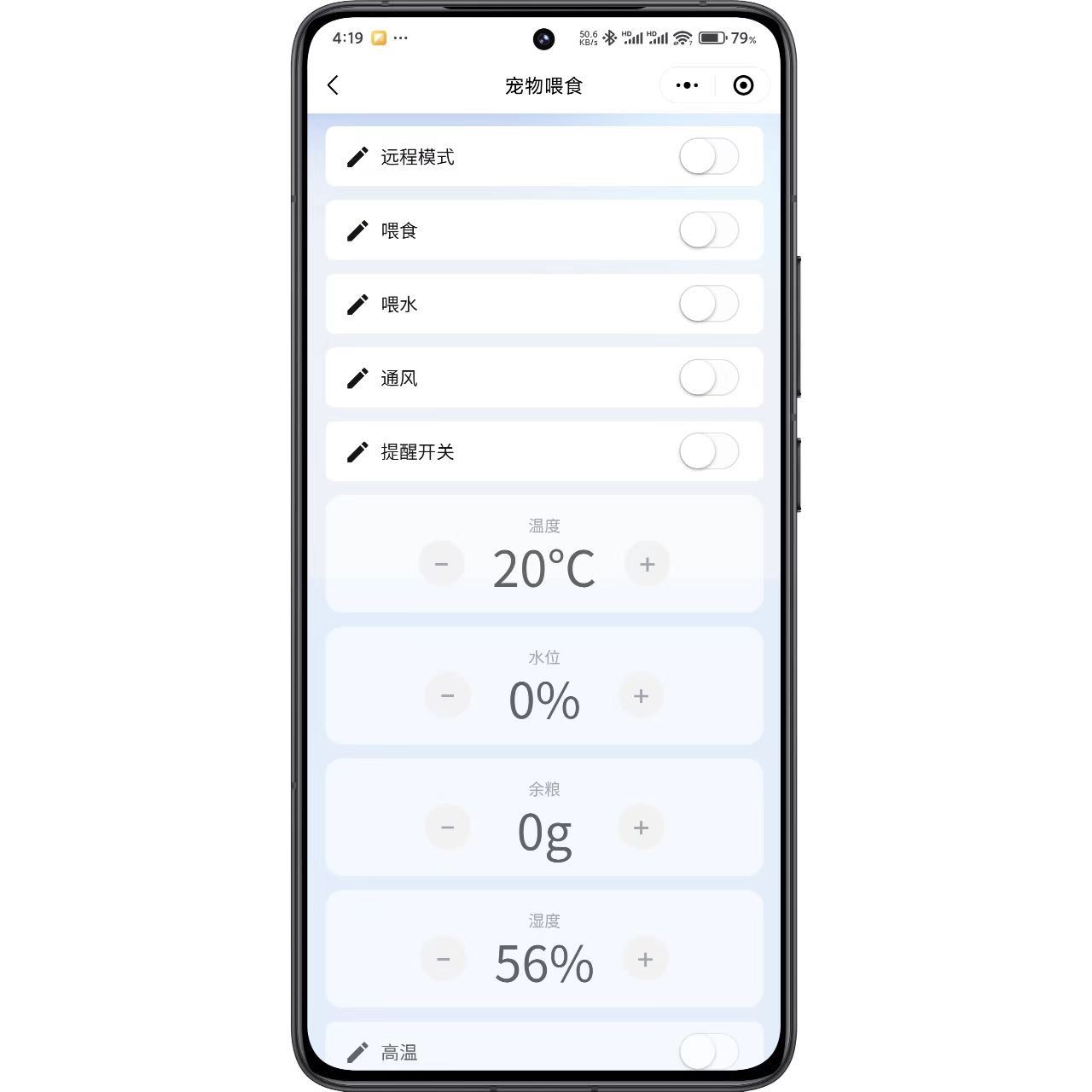 定时喂水喂食:可以通过手机端微信小程序设定定时时间进行喂水喂食。