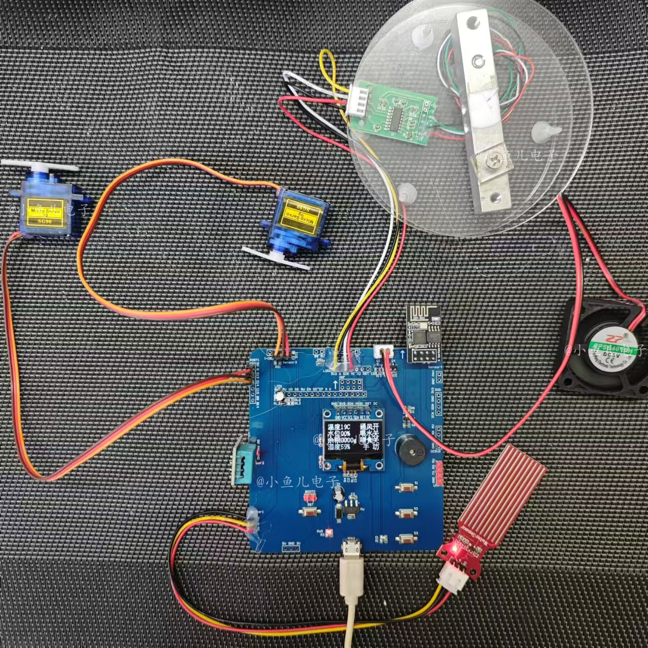 水位检测:采用水位传感器实时监测宠物喂食装置储存的水位情况,当水位低于设定阈值时,蜂鸣器报警提醒,并向饲养者推送“喂食器储水量不足”进行提醒。