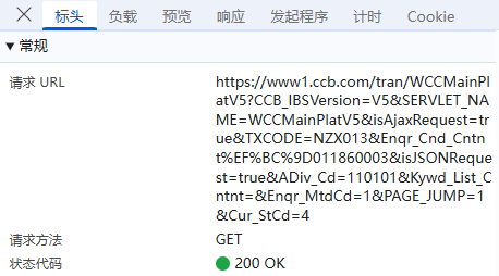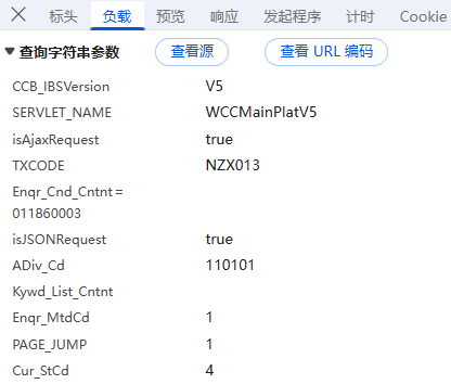 负载:对于GET请求:负载通常包含了传递的参数,有些网页负载可能为空,或者没有负载,因为所有参数都通过URL传递,这里我们可以看到ADiv_Cd(行政区编码),PAGE_JUMP(页码)等标签,没有进行加密;