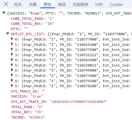 预览:指的是对响应内容的快速查看或摘要显示,可以帮助用户快速了解返回的数据结构或内容片段,我们可以看到数据在OUTLET_DTL_LIST里;