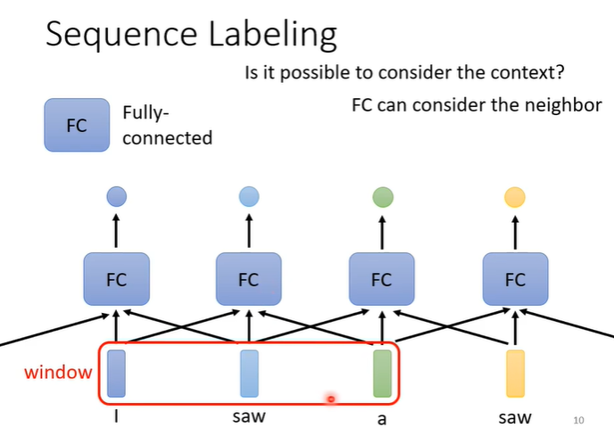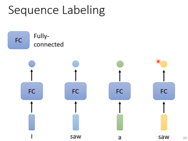 我们着重学习第一种类型,即输入每有一个向量,则有一个对应的输出。对句子中的每一个向量都给它一个label。例如在词性标注时,用fully-connected network处理,但此方法有一个问题,如上图中两个部分输入都为“saw”时,他们的输出是一致的,与我们期望的一个“v”(动词),一个“n”(名词)不相符。