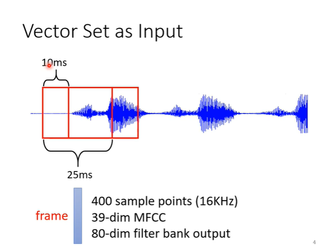 声音处理也可以作为例子,一段声音讯号其实是一排向量,把一段声音取一个范围(windows),把范围内的资讯描述成一个向量(frame),要处理整个声音就把windows向右挪动。