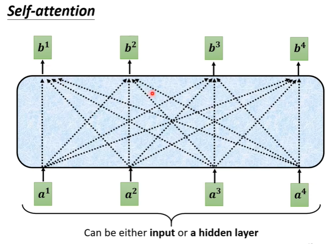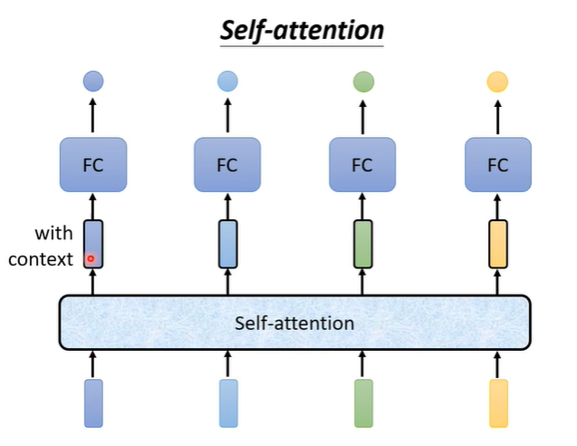 Self attention会把句子的词汇全部作为输入,输出有几个向量,就输出几个向量。他的输出会考虑句子中的每一个输入,再把处理后的输出作为FC的输入,这样FC就不是只考虑部分,而是考虑整个句子。
