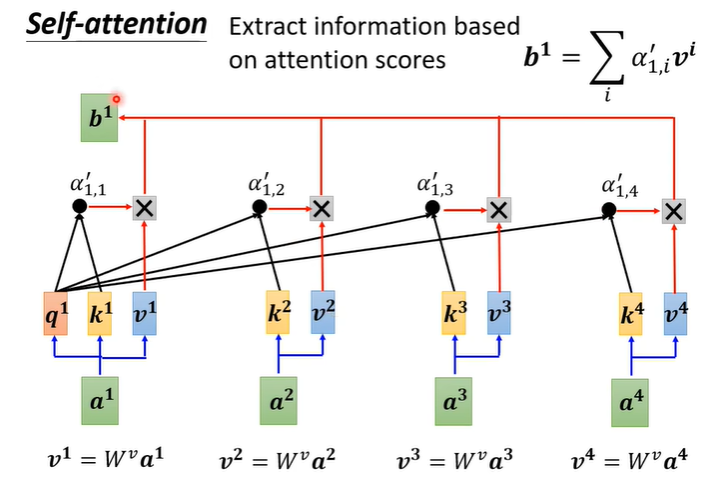 根据关联性抽取重要资讯,将每个输入a乘上得到新的向量v,将v与