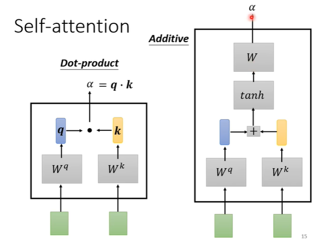 关联度如何计算?常见的做法有Dot-product,将输入的两个向量分别乘上不同的矩阵,假设得到q,k两个向量,然后做点乘;另一种方法是Additive,同样将输入的两个向量分别乘上不同的矩阵,假设得到q,k两个向量,将他们相加后,过一个function再过一个transformer。