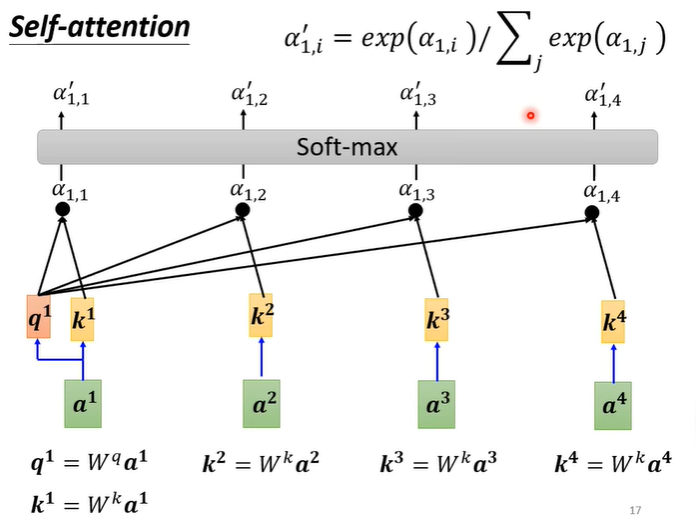 用Dot-product计算a1与其他输入的关联度,计算后需要经soft-max处理,得到。
