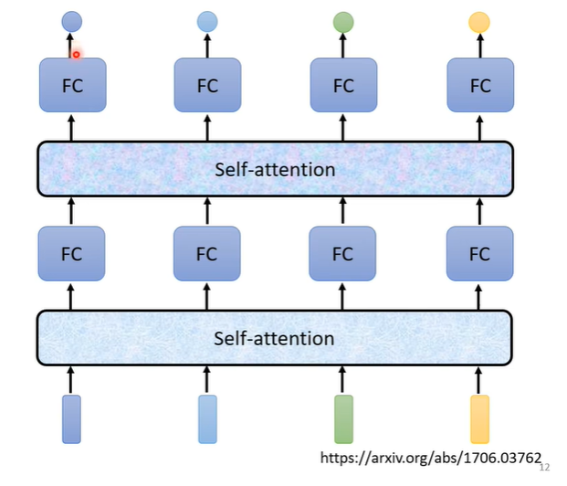 Self attention不是只能用一次,可以用一次Self attention输入FC后再用一次Self attention,再丢到另一个FC中,最后输出结果。