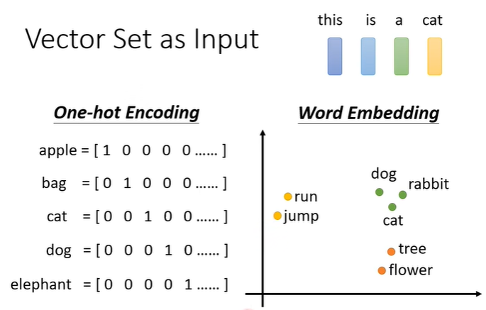 用文字处理作为例子,每个句子的长度都不同,如果把句子里的每一个词汇描述成向量,那我们的输入就会变成不固定数目的一组向量,将词汇变成向量有很多种方法,如上图所示的one-hot encoding,word embedding等。