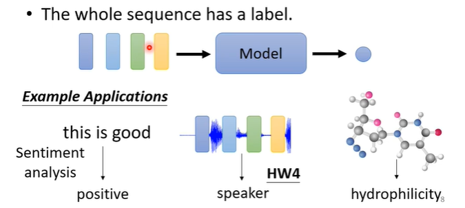 第二种可能是,我们只需要一个输出,无论输入多少个向量,输出只有一个,例如sentiment analysis(分析句子情感是正面或负面),或者是语言辨别,判断是谁说的话等