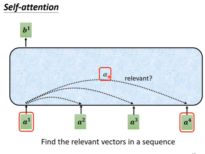Self attention首先找到a1相关的向量,对于所有输入的向量判断他们的关联度。