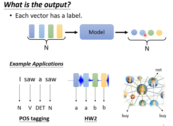 第一种可能是,每一个向量有一个对应的输出,假设输入四个向量,输出可能有四个数值或者是class,在文字处理上可能会用到,例如词性标注等