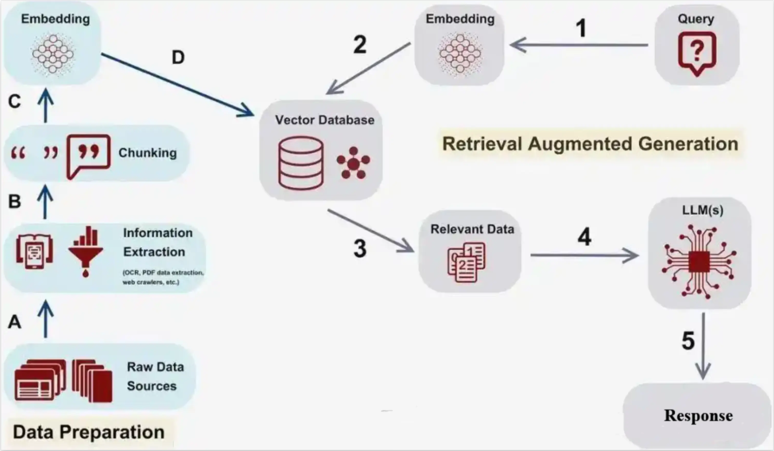 与依赖静态训练数据的传统大语言模型不同,RAG 在生成响应前通过集成 信息检索 机制,从数据库、网页等来源中提取相关文本,从而提升模型生成内容的准确性与时效性。