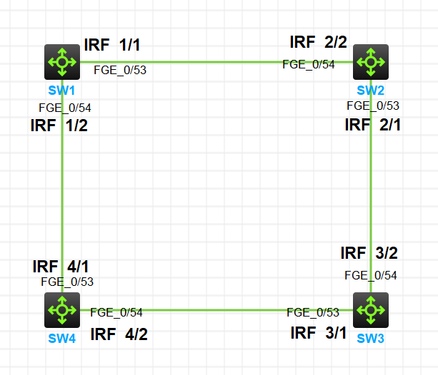 - SW1,SW2,SW3,SW4 组成一台IRF 堆叠设备
