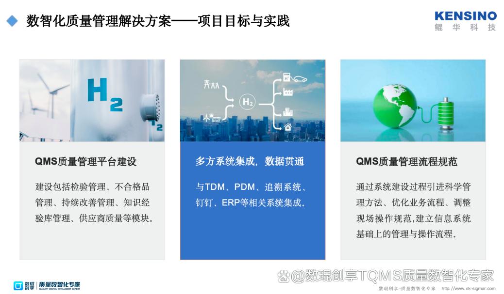 项目启动之初,数琨创享专家团队通过深入理解新能源行业客户的质量管理需求,以 Sigmar QMS 为底座,核心围绕“平台化、流程化、智能化”三大方向,提供TQMS数智化全面质量管理解决方案,聚焦鲲华科技质量管理核心功能的实现与业务流程的贯通,明确了业务一体化、系统集成化、管理智能化三大核心目标: