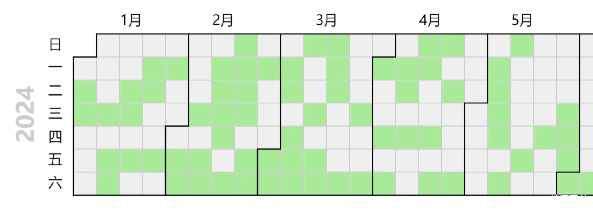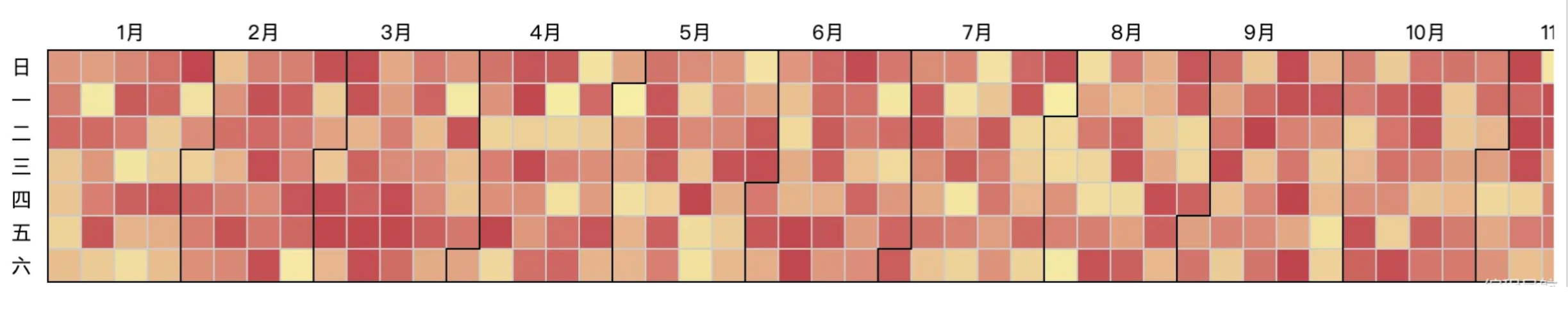 复杂的展示组件肯定不用自己开发,只要是图表(可视化),就可以优先考虑使用选择基础日历图,不涉及热力数值的区分(只有 0 和 1 签到 / 未签到的区别):